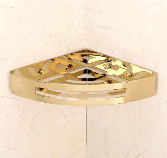 The space-saving corner design (8.5 x 8.5 inches) fits neatly into unused corners, offering ample room to organize toiletries, shower essentials, spice jars, or cleaning supplies. Finished in an elegant gold coating, it adds a premium touch to modern and luxury interiors.