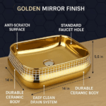 The smooth, easy-to-clean surface ensures long-lasting shine, while the scratch and stain-resistant ceramic guarantees durability for years of use. Designed for countertop installation, the Messina Germany Gold Marble Basin offers effortless style and convenience — perfect for homes, hotels, and premium spaces.