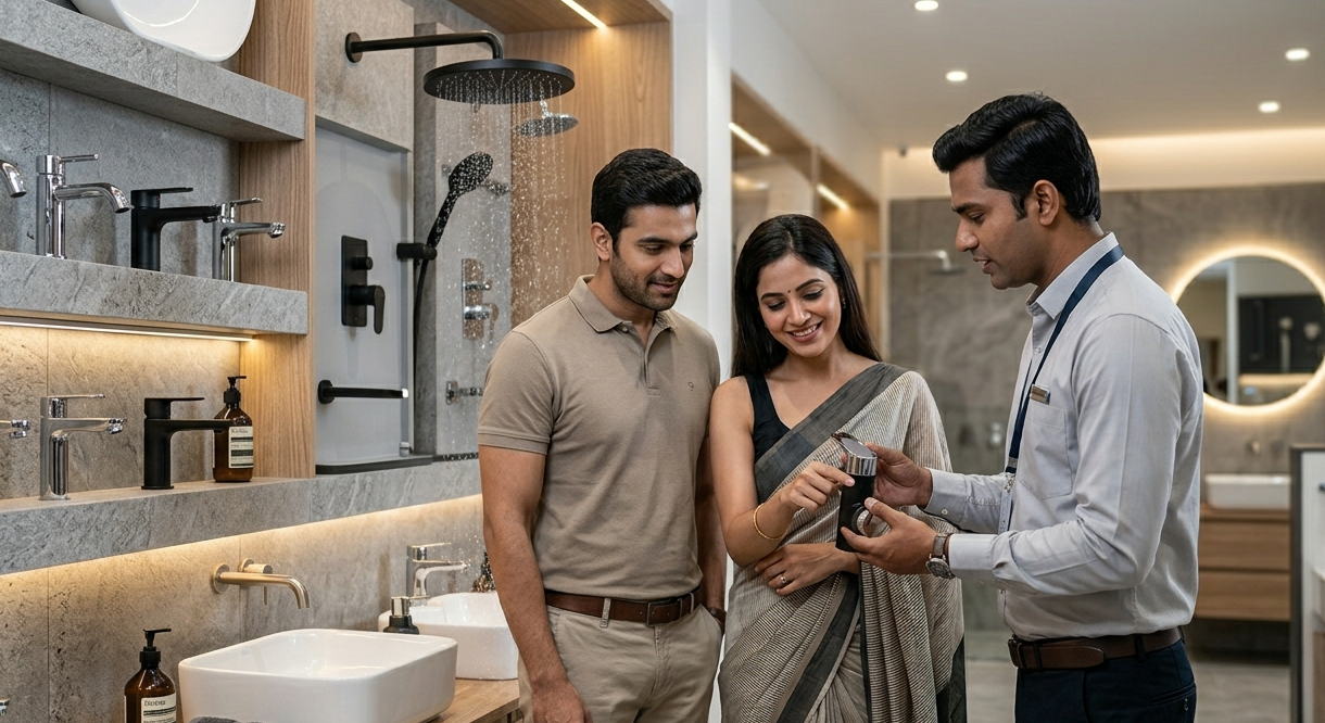Uske bathroom ke liye compact rain shower + hand shower combo best hai